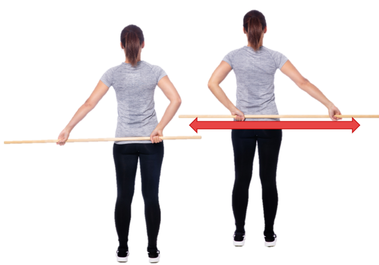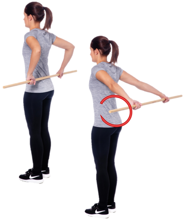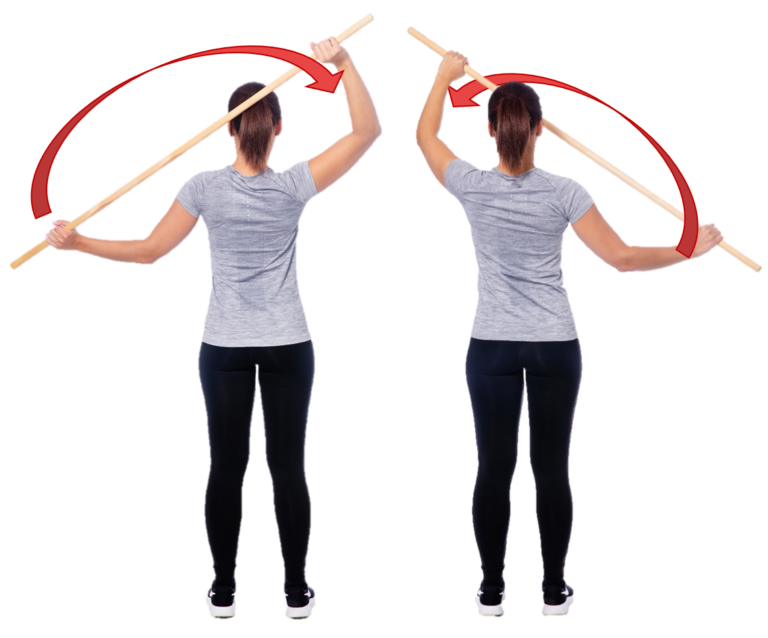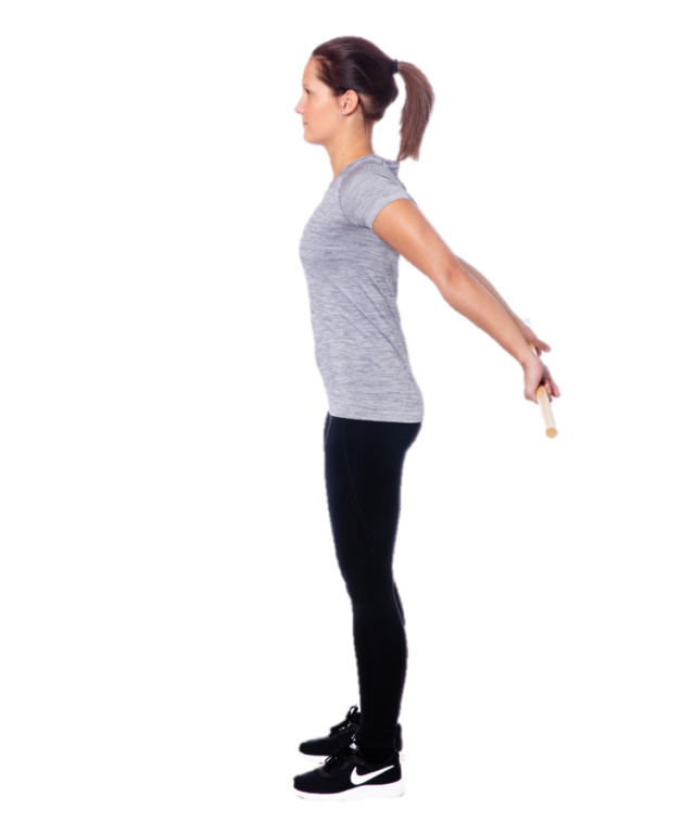 Seiso ryhdikkäässä asennossa ja vie keppi selän taakse poikittain. Ota leveä myötäote kepistä. Vie keppiä edestakaisin poikittaissuunnassa selän takana sivulta sivulle mahdollisimman pitkälle.