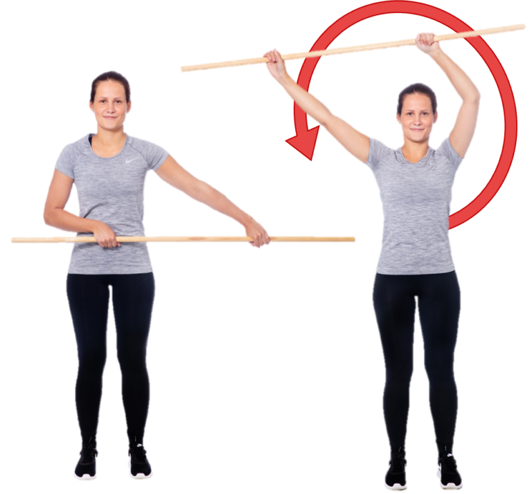 Seiso ryhdikkäässä asennossa ja vie keppi selän taakse poikittain. Ota leveä myötäote kepistä. Tee ympyräliikettä rauhallisesti selän takana vieden keppi mahdollisimman pitkälle taakse. Tee ympyräliikettä molempiin suuntiin.