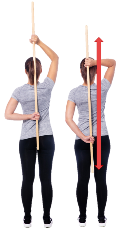 Seiso ryhdikkäässä asennossa ja vie keppi selän taakse pitkittäin. Ota toisella kädellä kiinni kepin yläosasta myötäotteella ja toisella kepin alaosasta vastaotteella. Liu’uta keppiä edestakaisin pituussuunnassa selän takana ylös ja alas. Vaihda käsien paikkaa ja tee uudelleen.