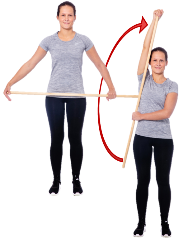 Seiso ryhdikkäässä asennossa. Ota toisella kädellä myötäote kepistä ja vie toinen kämmen kepin päähän. Vie kepin päässä oleva käsi sivukautta ylös. Toinen käsi avustaa liikettä tarvittaessa. Toista liike toiselle puolelle.