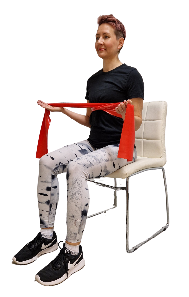Laita rintakehän ympärille kuminauha tai huivi. Istu tuolin etureunalla selkä suorana, nilkat ja polvet päällekkäin. Hengitä sisään nenän kautta siten, että rintakehä laajenee kuminauhaa vasten. Hengitä ulos hitaasti kapean huuliraon läpi antaen kuminauhan kaventaa rintakehää. Nosta harjoituksen ajan alavatsaa lempeästi sisään ylös ja keskity pitämään hartiat rentoina.