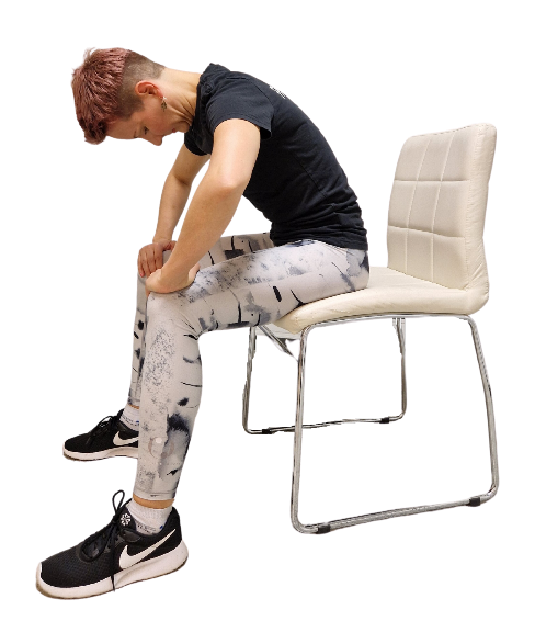 Istu tuolin etureunalla jalat reilussa haara-asennossa kädet polvien päällä. Taivuta ylävartaloa lonkista eteenpäin ja pidä selkä mahdollisimman suorana. Vedä vatsaa sisäänpäin ja tukeudu käsillä polviin. Uloshengityksellä kurota oikea käsi vartalon jatkoksi korvan viereen ja sisäänhengityksellä palauta käsi polven päälle. Seuraavalla uloshengityksellä kurota vasen käsi vartalon jatkoksi ja sisäänhengityksellä palauta käsi polvelle.