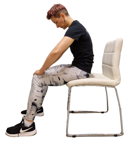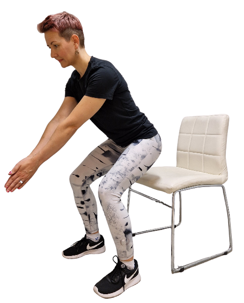 Istu tuolin etureunalla ryhdikkäästi lantion levyisessä asennossa. Sisäänhengityksellä ojenna selkä suoraksi ja uloshengityksellä nojaa eteenpäin lonkista kurottaen käsillä etuviistoon ja ponnista hallitusti ylös seisomaan. Sisäänhengityksellä työnnä lantio taakse ja istu hitaasti takaisin tuolin reunalle. Pyri pitämään selkä suorana sekä polvet ja varpaat samassa linjassa.