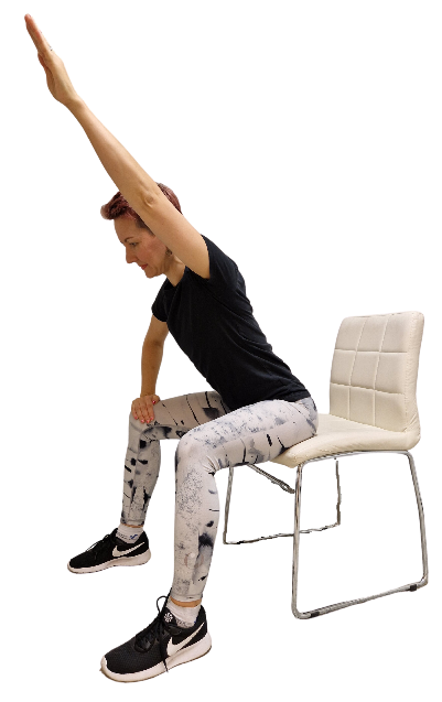 Istu tuolin oikeassa reunassa ja ojenna oikea jalka suoraksi sivulle. Tue vasemmalla kädellä tuolin reunasta. Sisäänhengityksellä kurota oikea käsi pään yli vartalon jatkoksi ja taivuta vartaloa vasemmalle sivulle kylkivenytykseen. Uloshengityksellä palaa takaisin alkuasentoon. Tee kylkivenytykset myös toiselle puolelle.