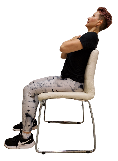 Istu ryhdikkäästi selkä tuolin selkänojaa vasten. Tuo kädet rintakehän päälle. Sisäänhengityksellä pidennä selkää, nosta rintaa ja taivuta yläselkää tuolin reunan yli taaksepäin. Uloshengityksellä palaa alkuasentoon. Varmista, että tuoli ei pääse keikahtamaan taakse.